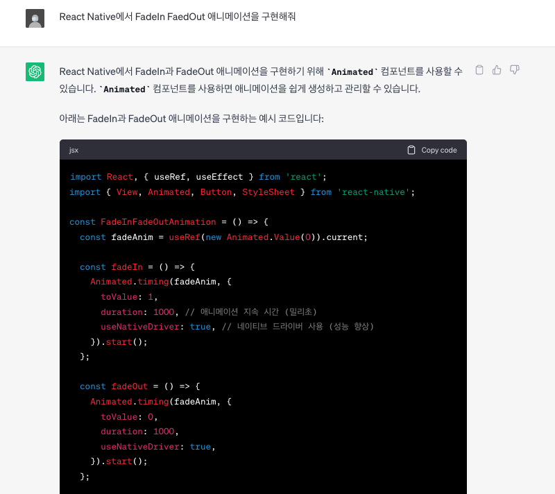 fadeAnim 변수는 useRef를 사용하여 Animated.Value(0)으로 초기화됩니다. 이는 애니메이션의 현재 값을 나타내는 변수입니다.