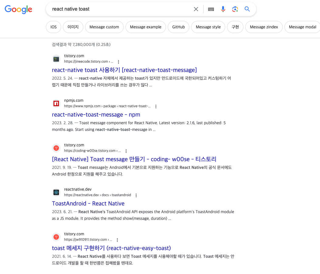 처음에는 디자이너 분과 얘기해서 라이브러리를 사용하려고 생각을 해서 여러 다양한 ToastMessage를 사용할 수 있는 라이브러리를 찾아보고 좋으신 분들이 작성해 주신 글도 읽어봤습니다.