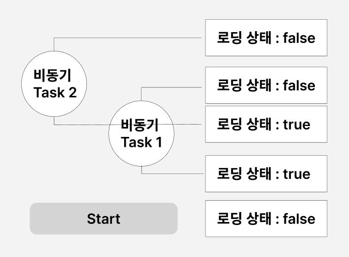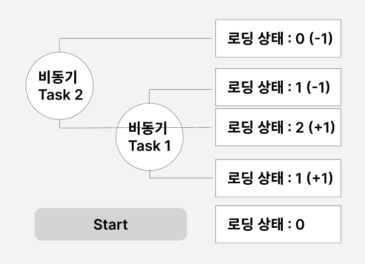 이런 식으로 0인 경우에 로딩이 사용자 화면에 보이지 않도록 구현한다면 비동기 Task2가 끝날 때까지 사용자는 로딩이 활성화되어 있는 화면을 볼 수 있습니다.